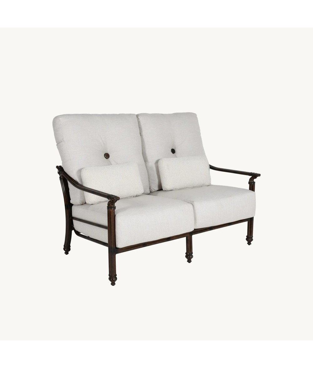 The Coco Cushioned Loveseat offers an intimate seating option that doesn't compromise on style or comfort. With a sculpted aluminum frame and handcrafted details that evoke natural rattan, it brings a soft, coastal feel to patios, porches, or garden spaces. Two plush cushions provide support for relaxed conversations or quiet afternoons outdoors. Built from durable cast and extruded aluminum, it’s designed to withstand the elements with ease. Made to order in your choice of Castelle fabric and finish, the loveseat is a seamless fit for personalized outdoor layouts.