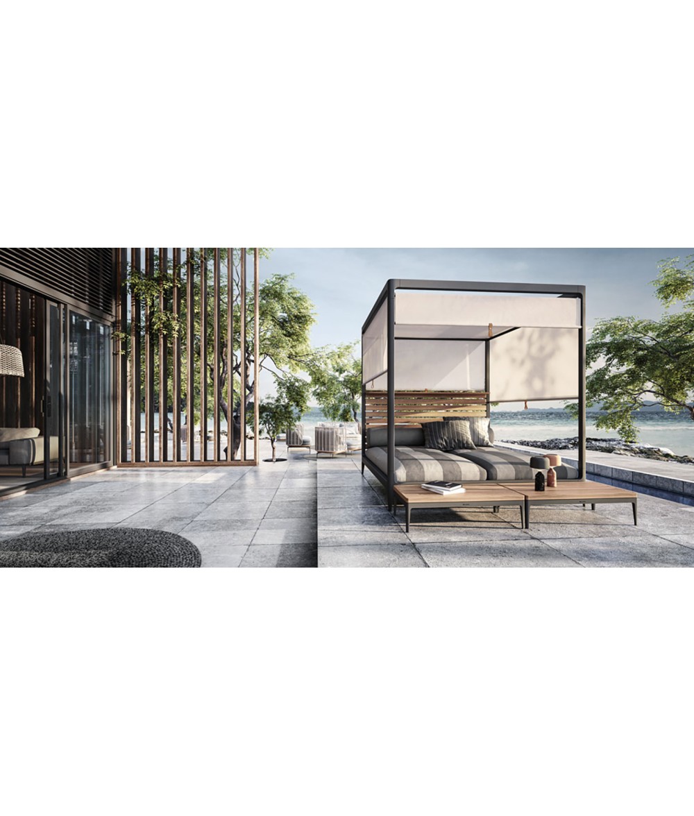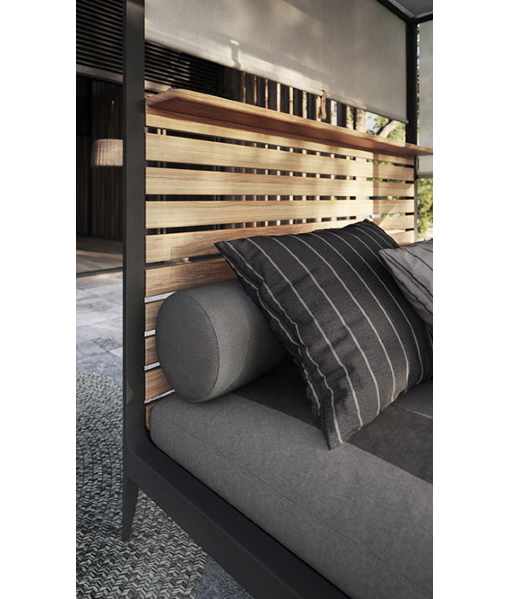 Material | 2x Nimbus colour, reciprocating sling fabric screens included. Natural finish, slatted teak back & roof panel. |