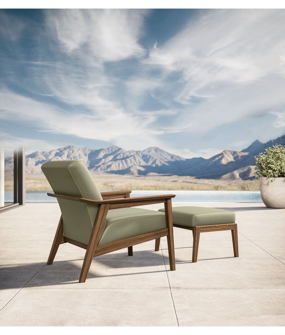 - Lounge chair is configured from an inspired interplay of an Ipe timber frame with a powder-coated aluminum base insert under premium, multi-layered cushions in a selection of Ultraleather® animal-free leather.