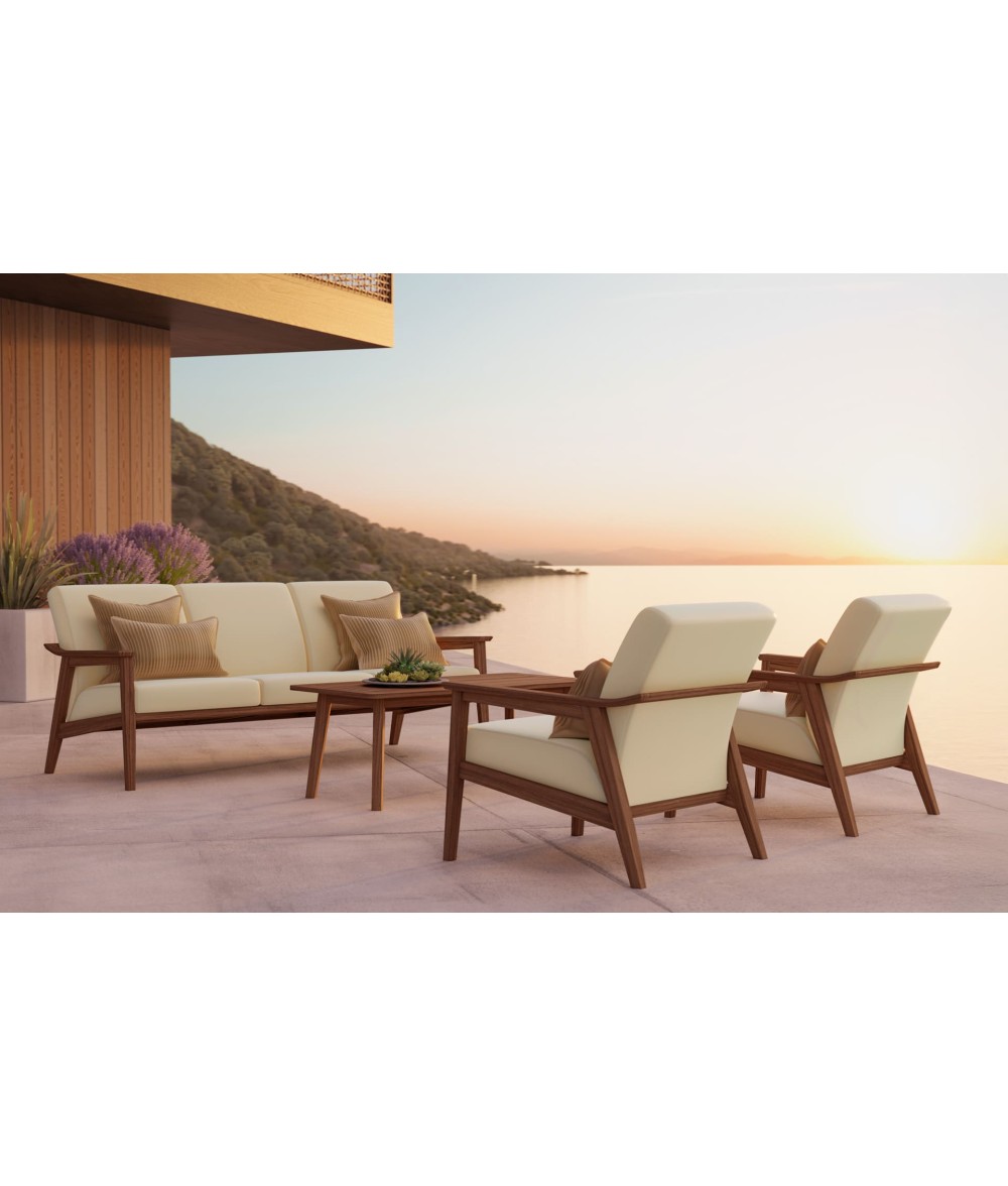Lounge in luxurious comfort with a contoured backrest, sculptural arms, and spacious seat crafted from individual slats of Ipe timber.