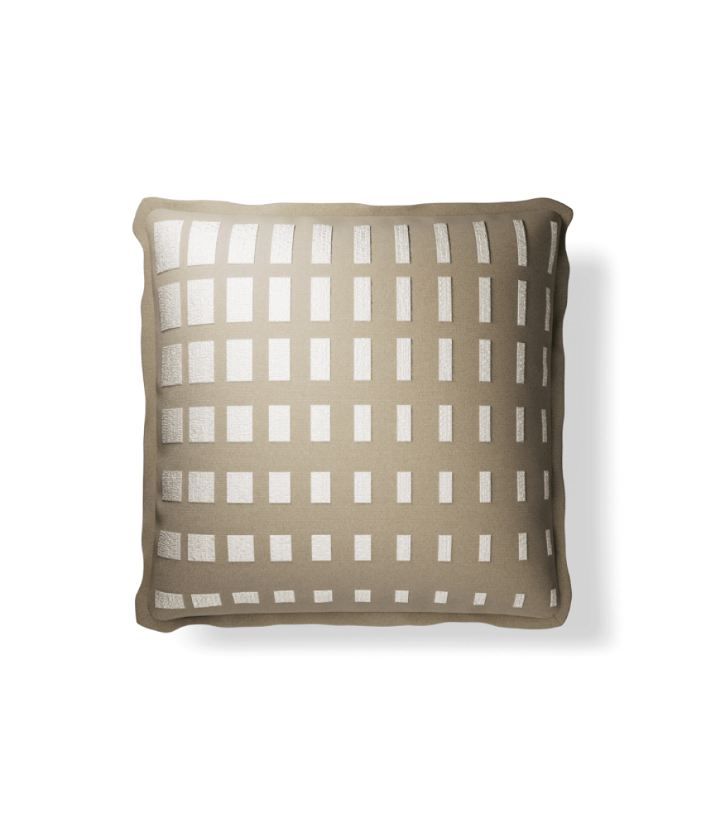 Plume Luxury Outdoor Throw Pillows: Style, Comfort, and Durability Redefined with the 20×20″ Shadow Block Desert/Ivory Throw Pillow.